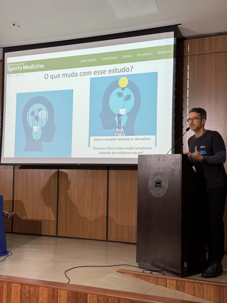 Com base em publicação do British Journal of Sports Medicine, Gomes apresentou a meta-análise demonstrando que o exercício físico apresenta efeito comparável à psicoterapia e semelhante ao uso de antidepressivos em casos leves a moderados, não devendo ser considerado apenas estratégia adjuvante, mas intervenção terapêutica central. Destacou ainda que exercícios aeróbicos apresentam forte impacto na redução da ansiedade, exercícios resistidos mostram efeito expressivo na depressão, e treinos combinados ampliam os benefícios clínicos.